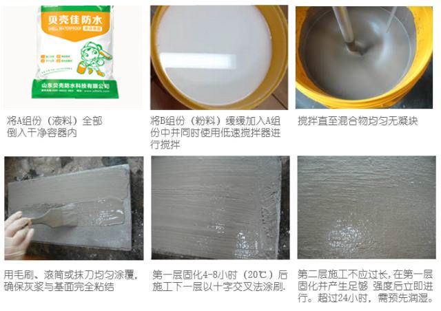 在传统聚合物防水A/B组份的基础上增加专用底涂液料。用专用底涂液料取代传统的用水湿润基面的施工方式。
