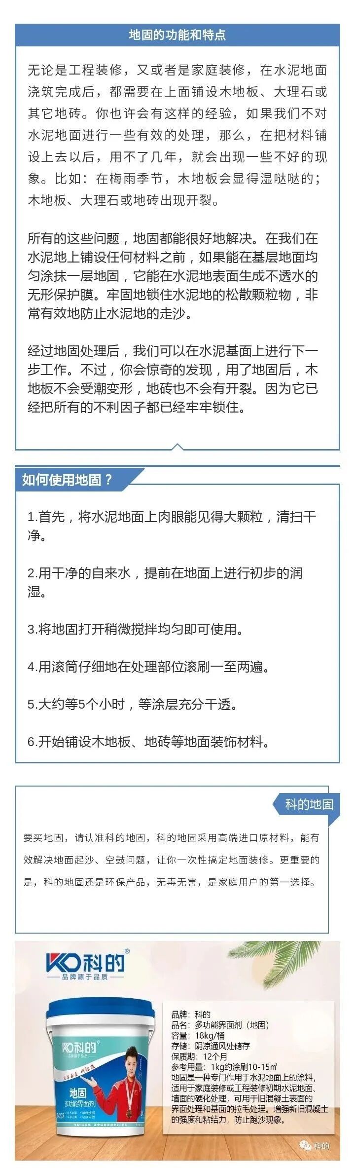 地固是一种专门作用于水泥地面上的涂料,是近几年比较新型的水泥地面界面处理剂。适用于家庭装修或工程装修初期水泥地面的封闭处理,防止跑沙现象。地固耐水防潮,也可以避免木地板受潮气侵蚀而产生的变形,同时避免日后从地板缝隙中“扑灰”。