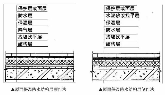 左图是平屋顶保温防水结构层顺作法,保温层在防水层之下;右图是平屋顶保温防水结构层倒作法,保温层在防水层之上。