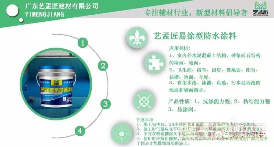 艺孟匠防水浆料采用德国技术研制而成的绿色环保型材料,是一种双组份、丙烯酸类高聚物改性的水泥基防水产品,由水泥、级配骨料和精选助剂的粉料及液态高聚物添加剂等组成