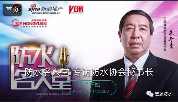 由中国建筑防水协会全力支持、新浪地产优采特别策划、宏源防水集团鼎力承办的《防水名人堂》栏目今天下午2:30首播。