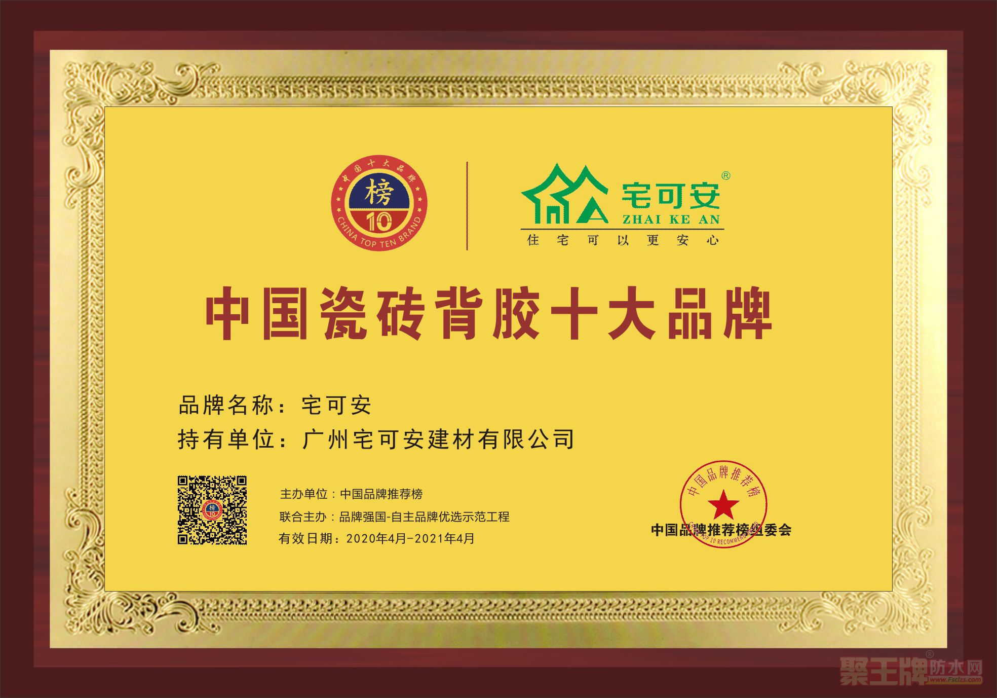 “宅可安防水”将承继新的使命---让住宅可以更安心,为消费者提供系统防水解决方案,更迅速、更有效、更持久的解决各类防水问题,宅可安防水涂料以其优良的品质和专业服务,产品被广泛运用于房屋建筑、高速公路、城市道桥、地铁及城市轨道、高速铁路、机场、水利设施等众多领域。2020年宅可安斩获“中国防水****”中国瓷砖背胶****”荣誉称号。