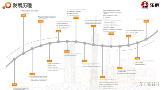 ■2016年:参编行业标准:《陶瓷饰面砖粘贴应用技术规程》。全国运营中心乔迁新址。成为“国家建筑材料行业职业技能线下实训基地(装饰装修工薄法贴砖)”,获得金砂奖“2015年度瓷砖胶行业十佳品牌”、“十佳优秀企业家”、“十佳创新人物”三项大奖;获得第十二届中国陶瓷行业新锐榜“最受工程用户喜爱产品-乐匠A04抛光砖粘贴胶” 大奖;成为广东省建筑防水材料协会常务理事单位、中国建材市场协会瓷砖胶分会常务理事单位、佛山市陶瓷行业协会理事单位;成为中国陶瓷工业协会瓷砖粘贴技术专业委员会理事单位、中国建筑业协会材料分会会员单位。