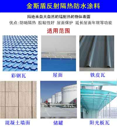 金斯盾金属屋面反射隔热防水涂料是由导热系数极低的空心微珠绝热材料,具有高效降温、薄层、装饰、自洁、防水、防潮、防紫外线 老化、耐酸碱、防腐于一体的新型常温降温节能长寿命涂料。